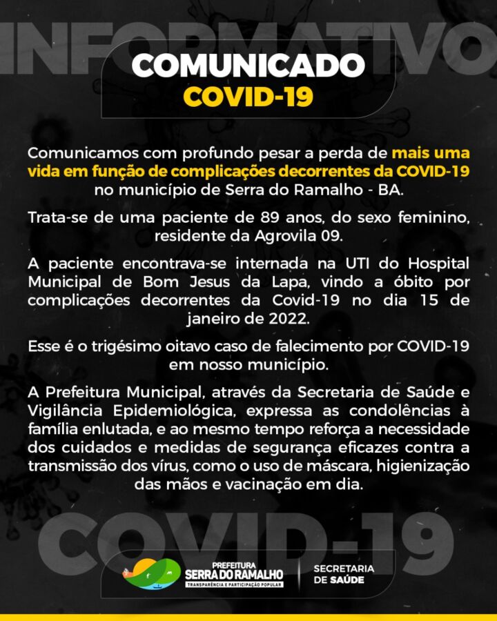O município registrou ainda o 38º óbito em decorrência da covid-19, veja nota abaixo: