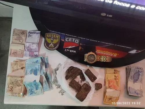 Na noite desta quarta-feira (10), por volta das 19h10, Policiais Militares integrantes do Motopatrulhamento Tático do 17º BPM realizavam rondas pela avenida Santos Dumont, no centro de Guanambi, quando avistaram um pedestre portando um volume na cintura, que ao avistar os policiais tomou sentido contrário repentinamente. Diante da atitude suspeita, a Guarnição efetuou a abordagem com busca pessoal, localizando em poder do mesmo, identificado pelas iniciais F.V.B.S, 07 pedaços prensados de substância análoga a maconha e a quantia de R$ 1.556,00 em espécie.