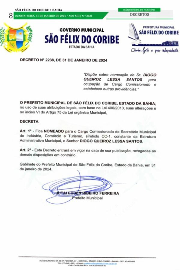 O suplente de vereador e líder político Diogo Queiroz é o novo secretário de Indústria, Comércio e Turismo de São Félix do Coribe.