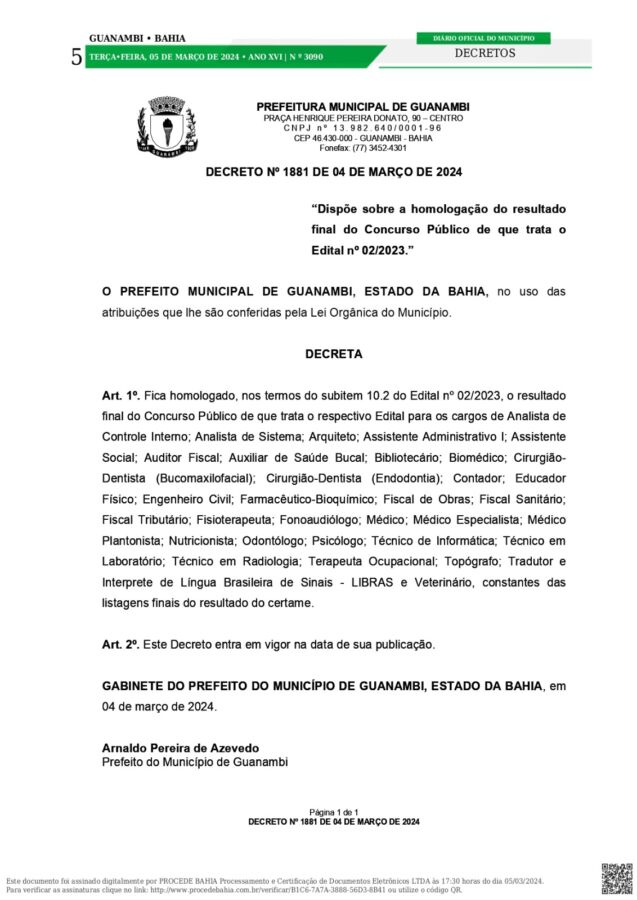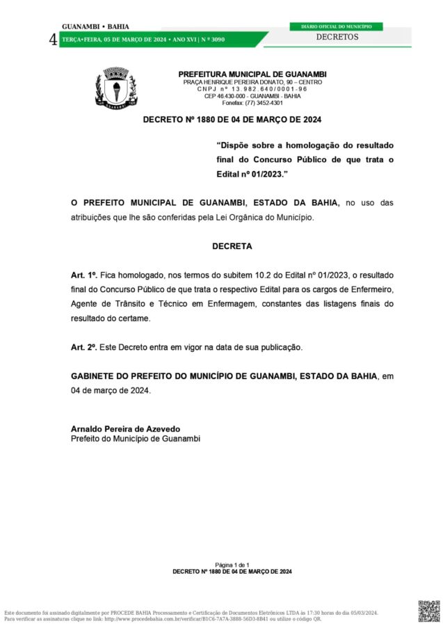 O Prefeito de Guanambi, Arnaldo Azevedo, conforme anunciado na última quinta (29), homologou, nos termos do subitem 10.2 do Edital nº 01/2023, o resultado final do Concurso Público de que trata o respectivo Edital para os cargos de Enfermeiro, Agente de Trânsito e Técnico em Enfermagem, constantes das listagens finais do resultado do certame.