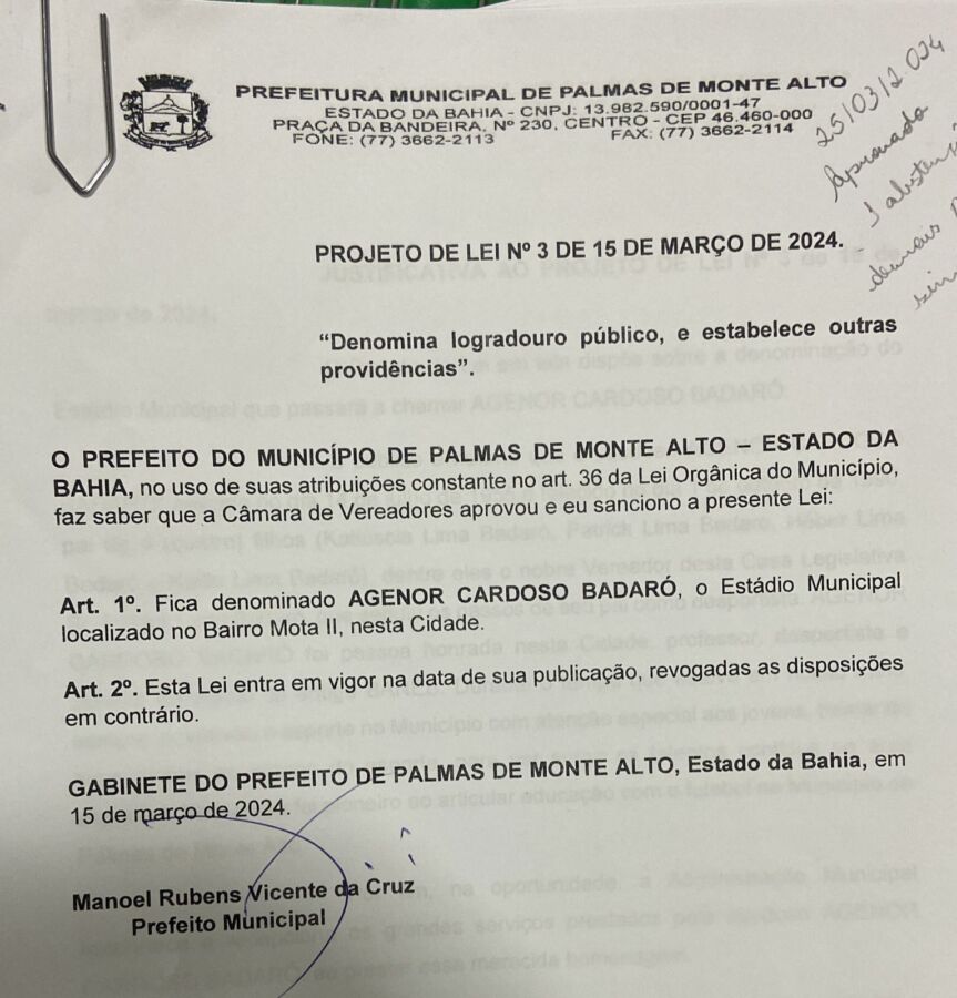 A Câmara de Vereadores de Palmas de Monte Alto realizou sessão ordinária na última segunda-feira (25) debatendo vários temas de interesse da comunidade, onde foi aprovado por unanimidade projeto executivo denominando o estado municipal de Agenor Cardoso Badaró, ocasião em que o vereador Patrick, filho do homenageado frisou: “agradeço aos colegas pela aprovação e ao prefeito Manoel Rubens pela homenagem”.