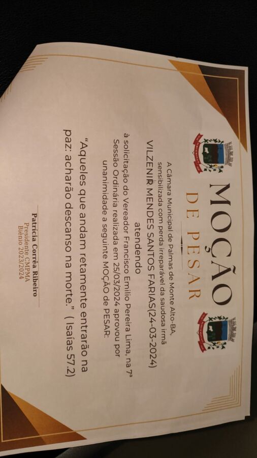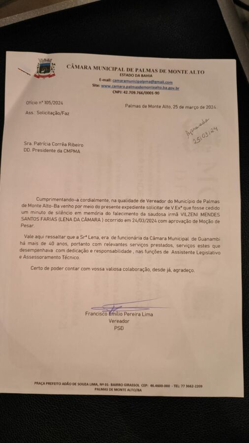 Na sessão, foi aprovada ainda moção de pesar de autoria do vereador Miro Lima pelo falecimento da servidora pública Vilzeni Mendes (Lena) dedicada funcionária e assessora parlamentar da Câmara de Vereadores de Guanambi, com relevantes serviços também prestados ao poder legislativo regional.