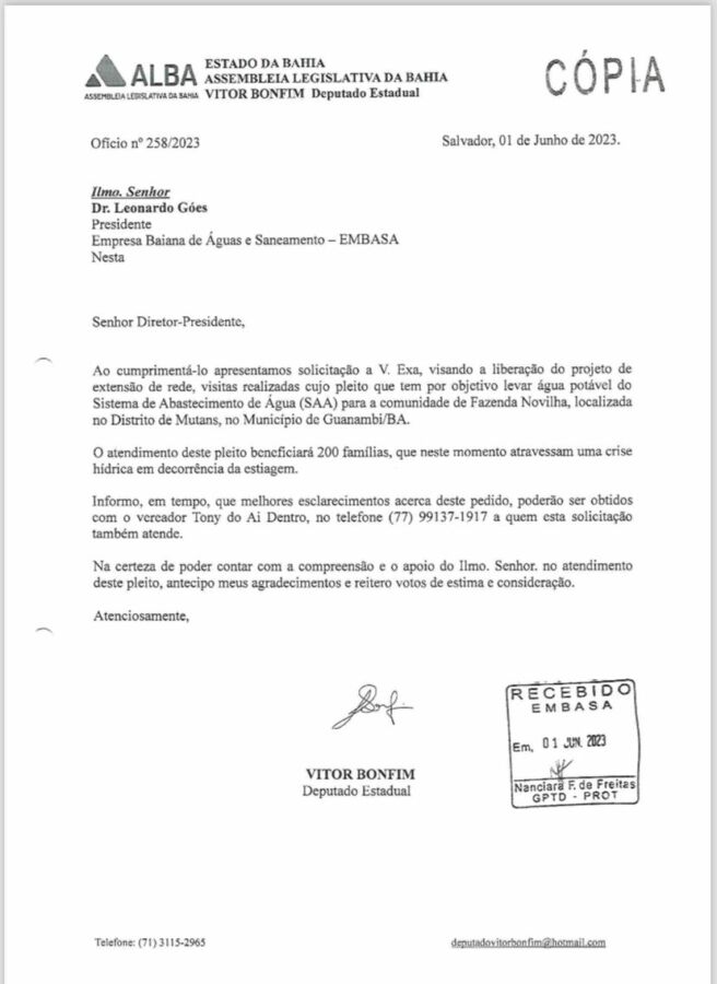Em parceria com o vereador Tony do Aí Dentro, o deputado estadual Vitor Bonfim viabilizou um importante benefício para a comunidade de Fazenda Novilha, em Guanambi, garantindo o abastecimento de água para 24 famílias. A obra foi realizada por meio de uma rede de quase 3 km de extensão, levando água potável e melhorando significativamente a qualidade de vida dos moradores da região.