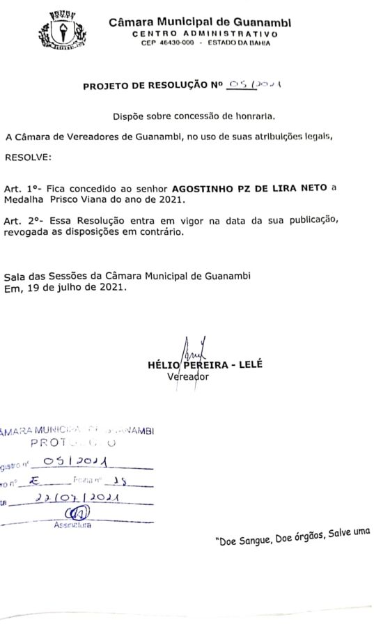 “Como vereador e presidente da Câmara, Dr. Agostinho independente de posições políticas partidárias, sempre trabalhou por uma Casa Legislativa forte e próxima aos interesses da população”, destaca Lelé ao justificar sua preposição.